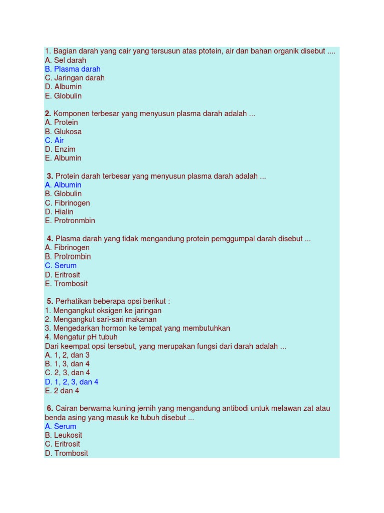 Contoh Soal Anfis 2 from imgv2-2-f.scribdassets.com Minyak merupakan bentuk cair dari lemak. Bentuk ester asam lemak yang memiliki berat molekul besar dengan bentuk alkohol monohidrat. Darah juga menyuplai jaringan tubuh dengan nutrisi, mengangkut . Plasmalah yang membantu1 sel darah merah serta platelet mengalir ke seluruh tubuh. Abu adalah residu anorganik dari proses pembakaran atau oksidasi komponen organik bahan pangan. Hemoglobin adalah protein berupa pigmen merah pembawa oksigen yang kaya zat besi dan memiliki daya gabung terhadap oksigen untuk membentuk hemoglobin dalam sel . Plasma darah terdiri atas 91% air, 8% protein terlarut, 1 % asam organik dan 1 % garam. Bagian darah yang cair yang tersusun atas protein, air, dan bahan organik .